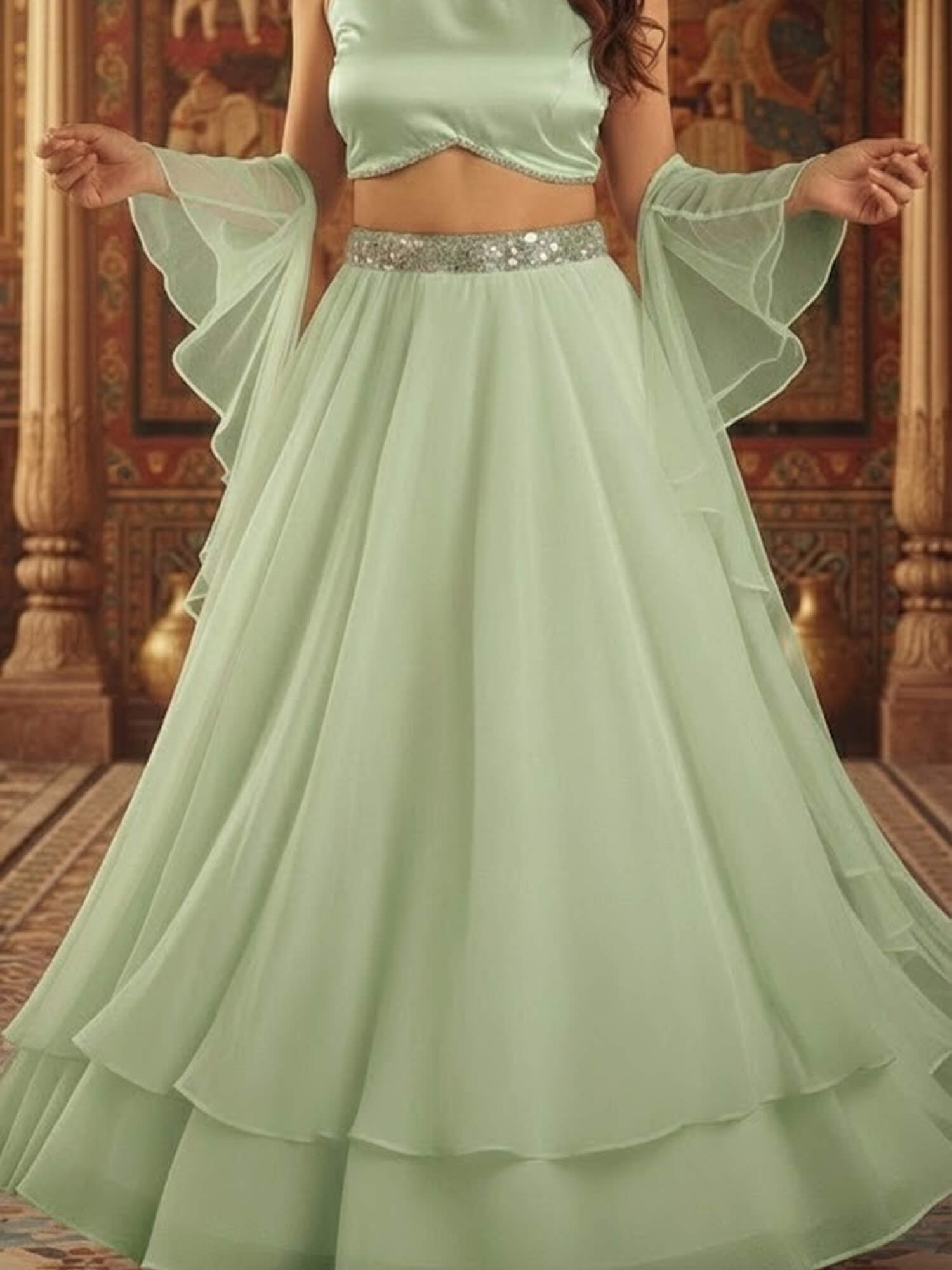 Skirt: Flared mint green organza lehenga featuring layered volume for an airy, flowy drape