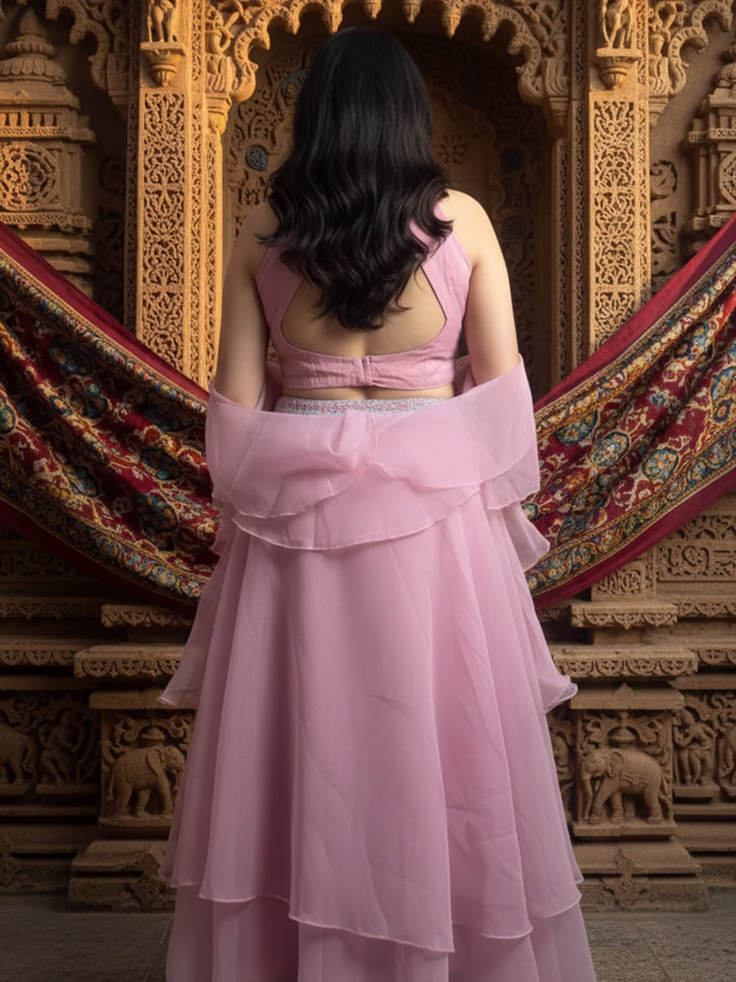 Skirt: Flowing pink organza lehenga with layered flare for a voluminous and ethereal look
