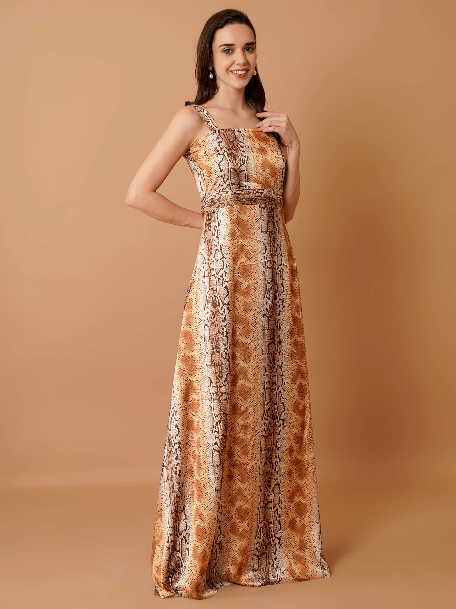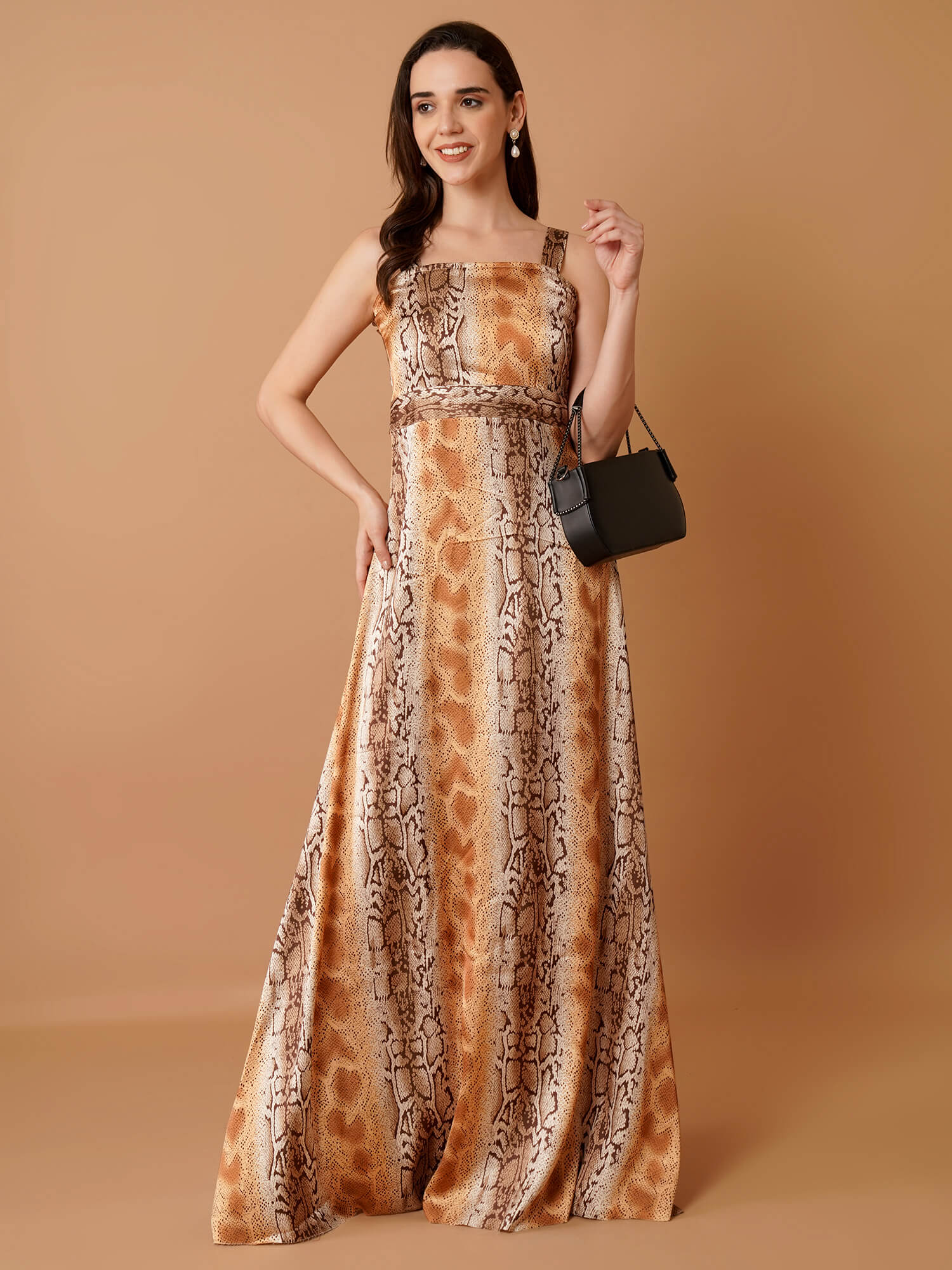 Make a bold statement with this Premium Satin Animal Print Gown by Magnetism. Crafted in luxurious satin fabric with a glossy finish, this gown features a striking snake skin print, a square neckline with broad straps, and a belted waist that defines the silhouette. The flowy floor-length flare makes it perfect for parties, cocktails, or festive evenings. Whether it’s a cocktail evening, festive celebration, or a special night out, this dress promises to make you the star of the occasion.