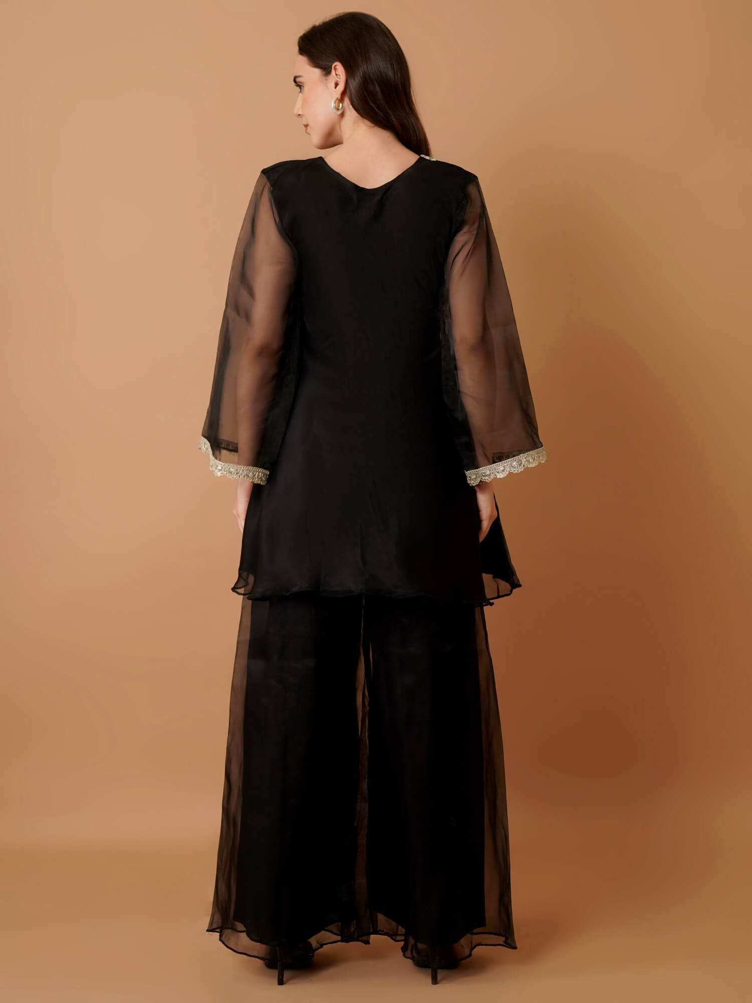 Elegant and timeless, this black organza kurti set comes with dhoti and a sheer dupatta, making it a perfect blend of grace and sophistication. The lightweight organza fabric adds a subtle sheen and flow, while the tailored palazzo ensures comfort and ease of movement. Paired with a dupatta, it creates a complete festive and occasion-ready look.