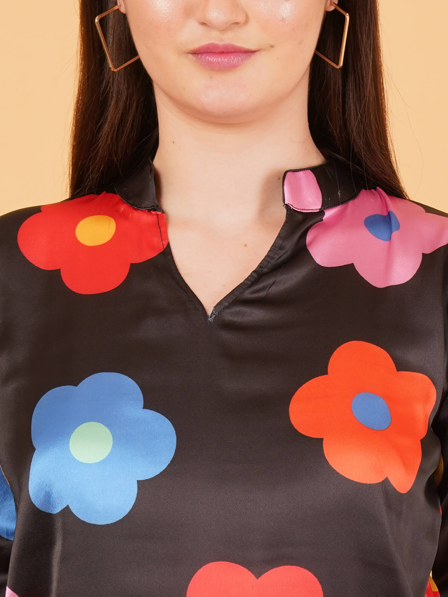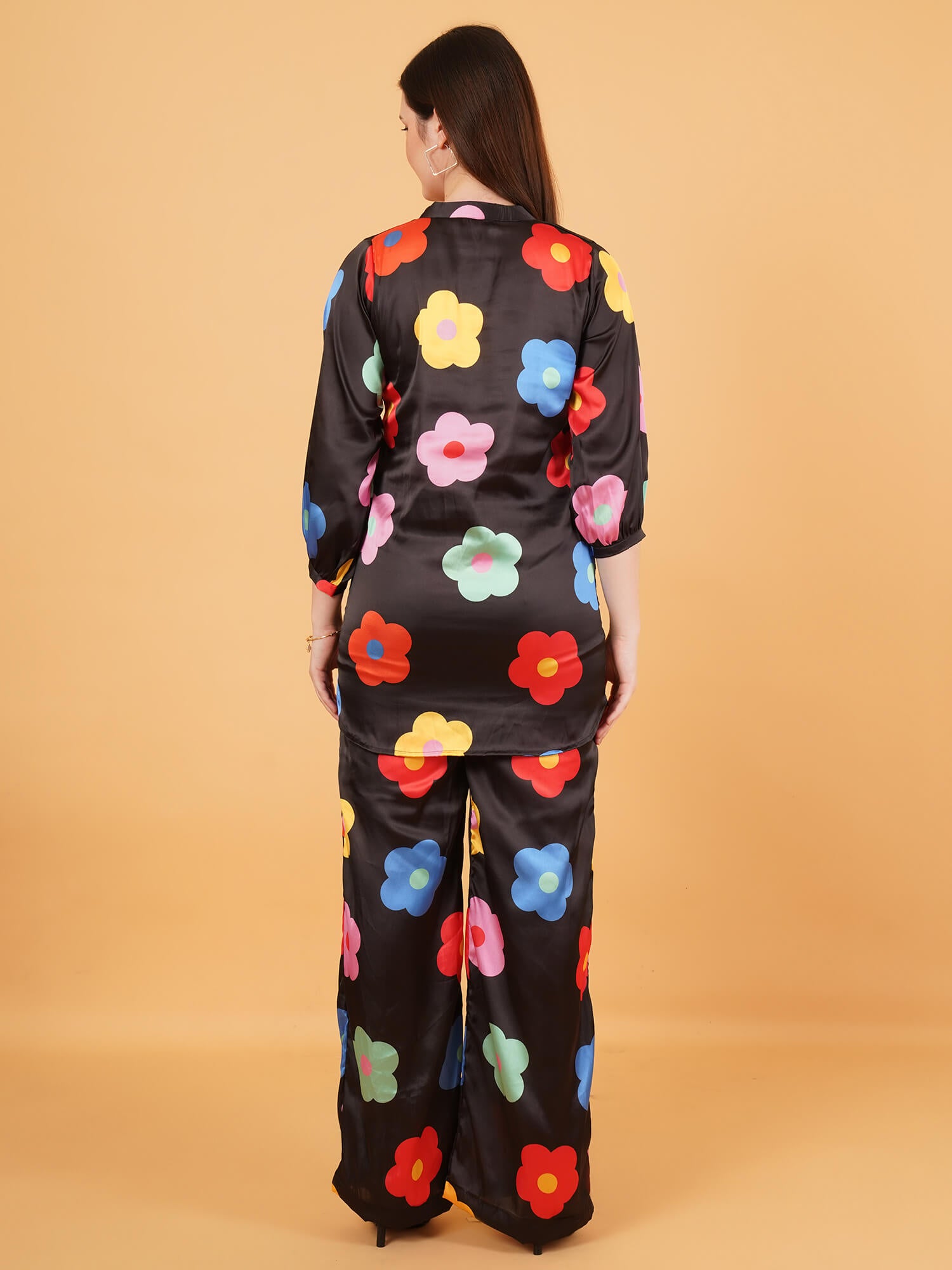 Make every moment feel like a celebration of colour with this Bold Bloom Satin Co-Ord Set. Designed for the woman who loves to stand out, this set features a playful oversized floral print in vibrant hues like red, yellow, blue, pink, and green — all set against a rich black satin background that adds elegance and shine. The ensemble includes a relaxed-fit long top with a V-slit neckline and 3/4th sleeves, paired with comfortable wide-leg pants, both tailored in smooth satin fabric that feels soft and luxurious against the skin. Whether you're heading to a brunch, lounging at home, or stepping out for a casual day, this set makes a bold fashion statement with minimal effort.