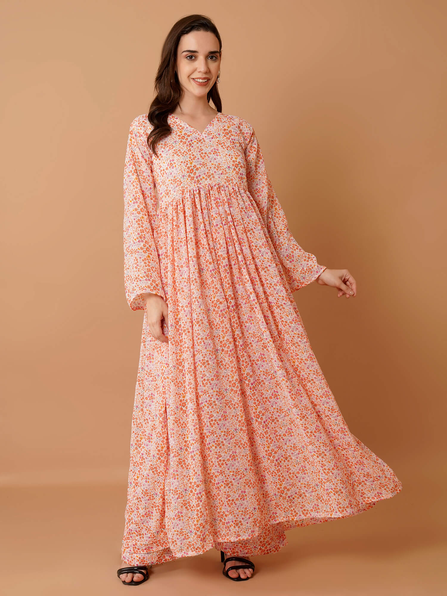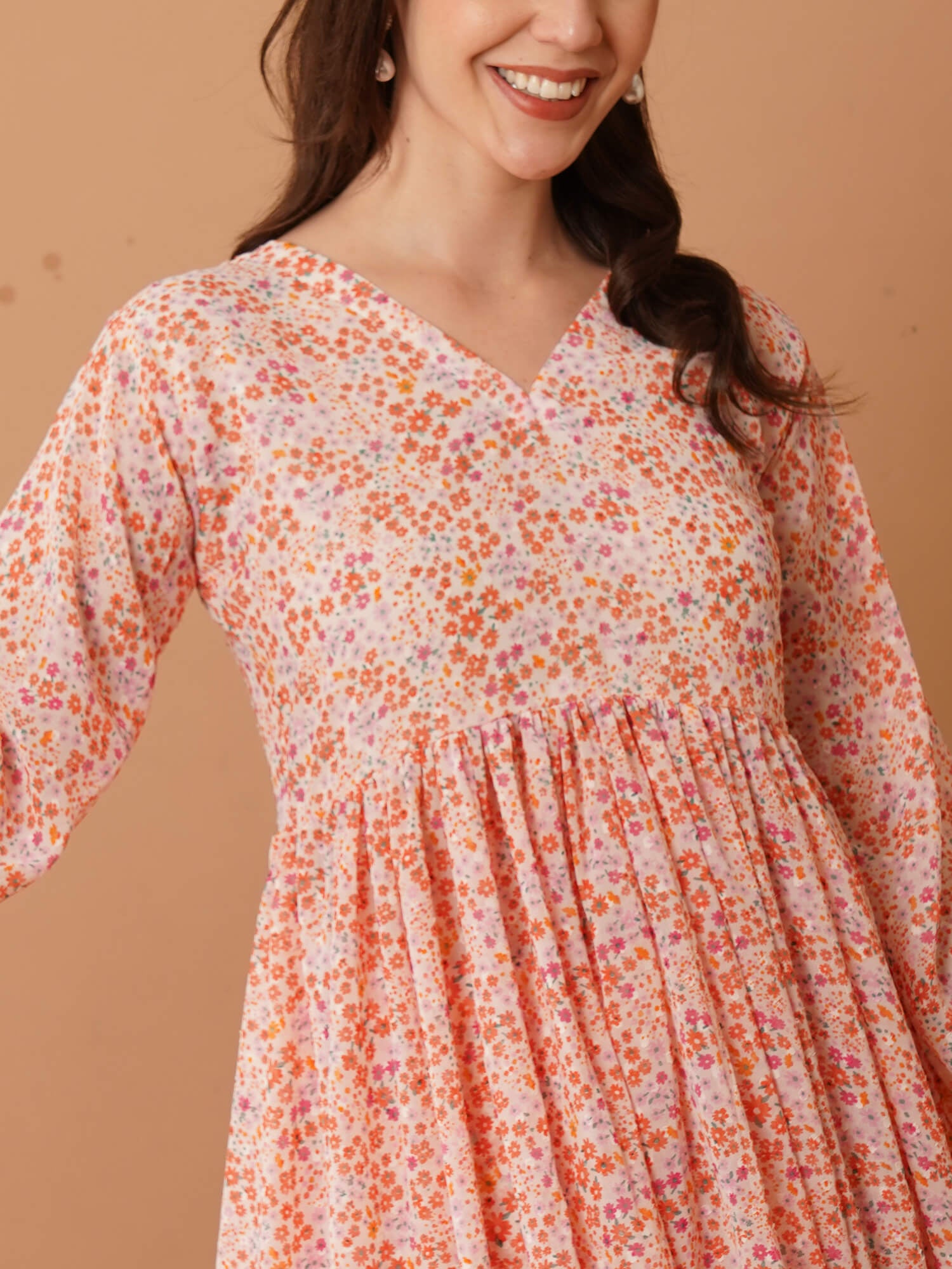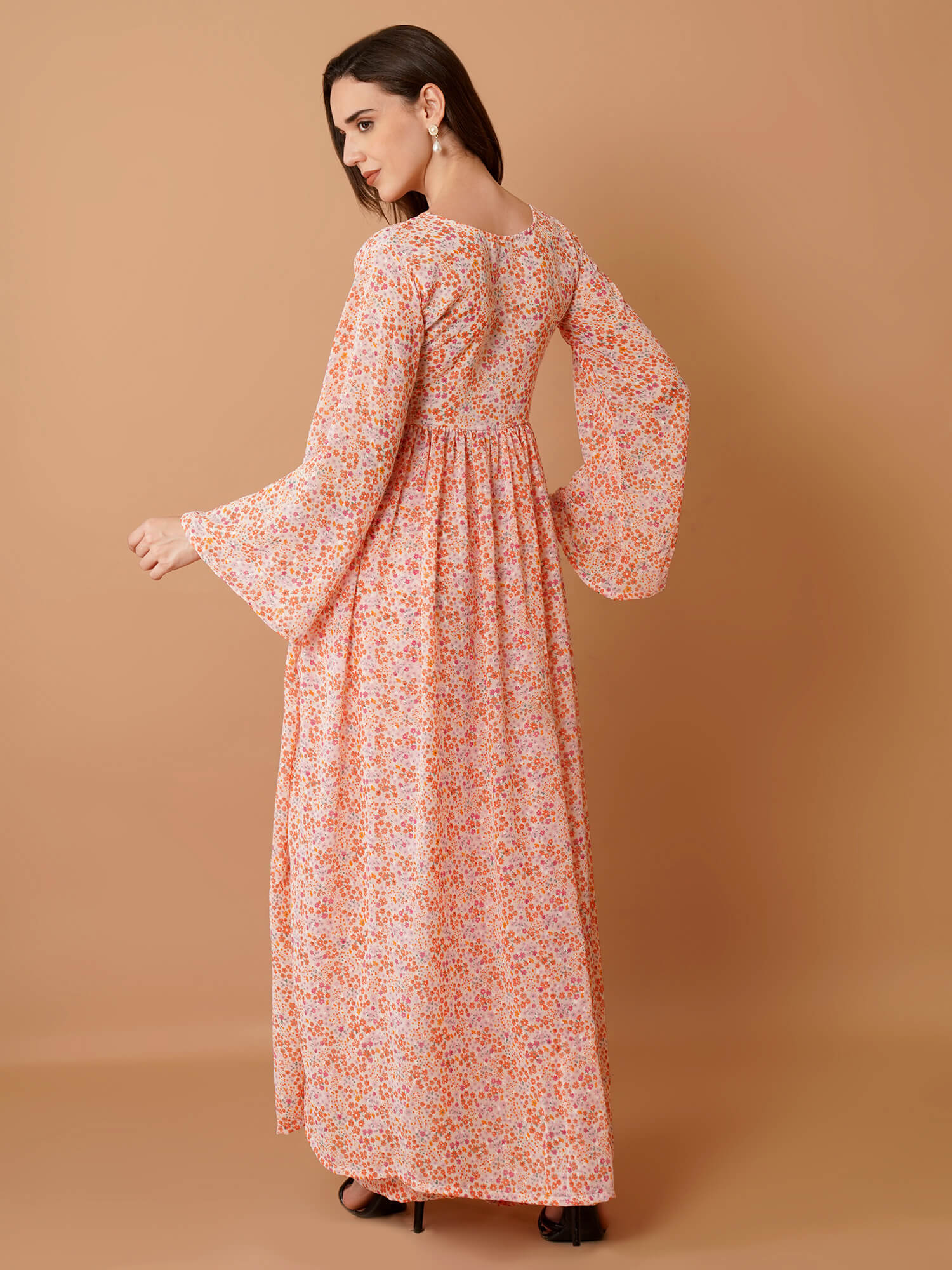 Effortless charm meets everyday comfort in this peach-pink floral maxi dress. Crafted in flowy fabric, it features a graceful V-neckline, relaxed full sleeves, and a breezy A-line silhouette that sways beautifully with movement. The all-over ditsy floral print adds a refreshing pop of colours, making it perfect for both casual strolls and cheerful brunch outings. With its light, airy feel and timeless floral charm, this dress is your go-to for days when you want to look pretty yet stay completely at ease.