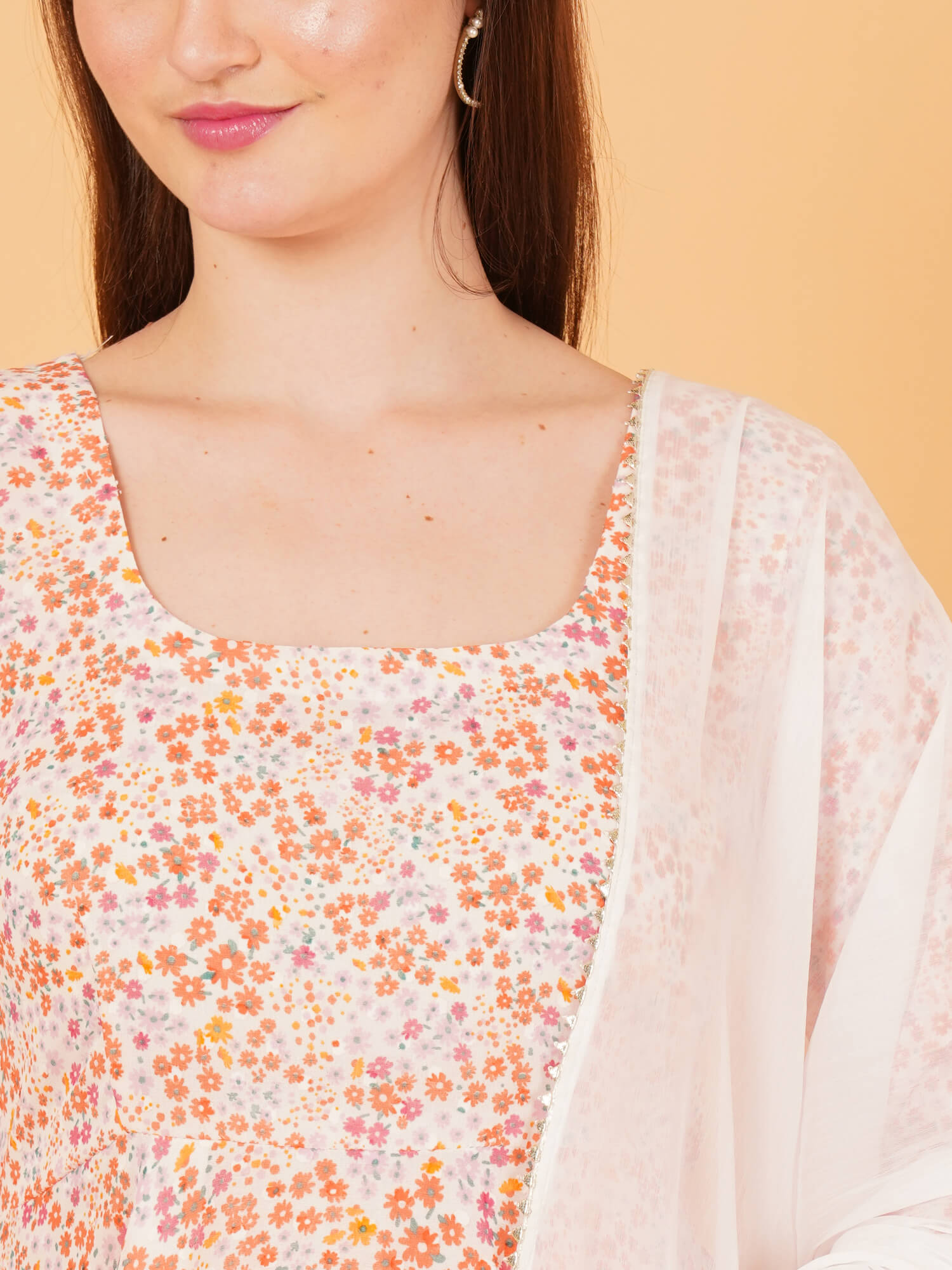 Grace your occasions with this Elegant Floral Anarkali Set, designed in soft, flowy chiffon fabric for all-day comfort and flair. Featuring a full-length anarkali silhouette, this outfit is adorned with a delicate peach floral print on a soft blush pink base, paired with a contrasting white dupatta to complete the graceful ethnic look. This outfit is perfect for festive events, haldi/roka ceremonies, family functions, or casual ethnic outings.