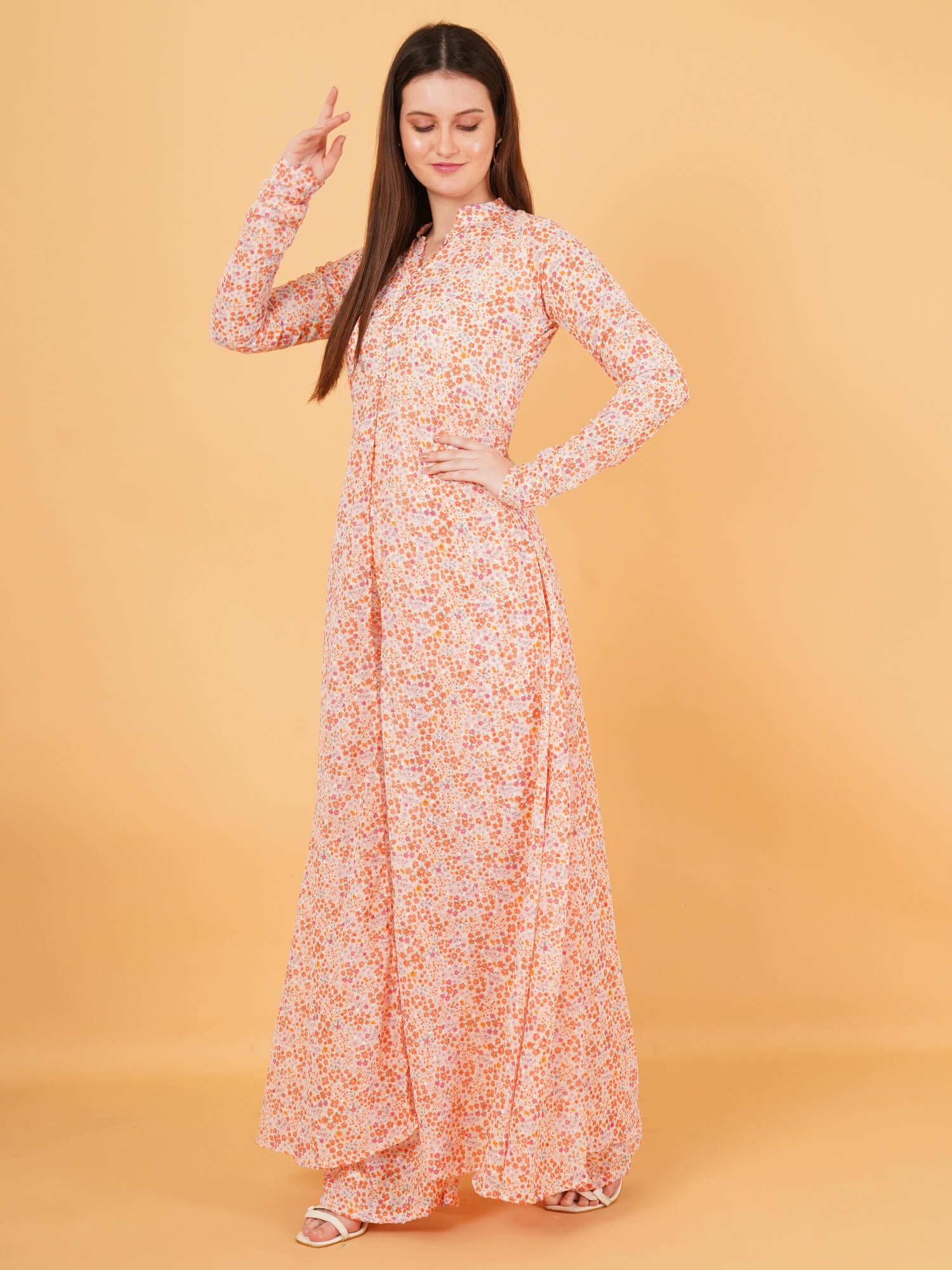 Step into effortless elegance with this Front-Open Floral Maxi Dress, crafted in soft chiffon fabric that drapes beautifully and keeps you comfortable all day long. With a flattering flared silhouette and vibrant peach floral print, this maxi dress is perfect for brunches, festive days, and vacation outings. The soft gathers and airy movement make it a must-have in your ethnic-fusion wardrobe.