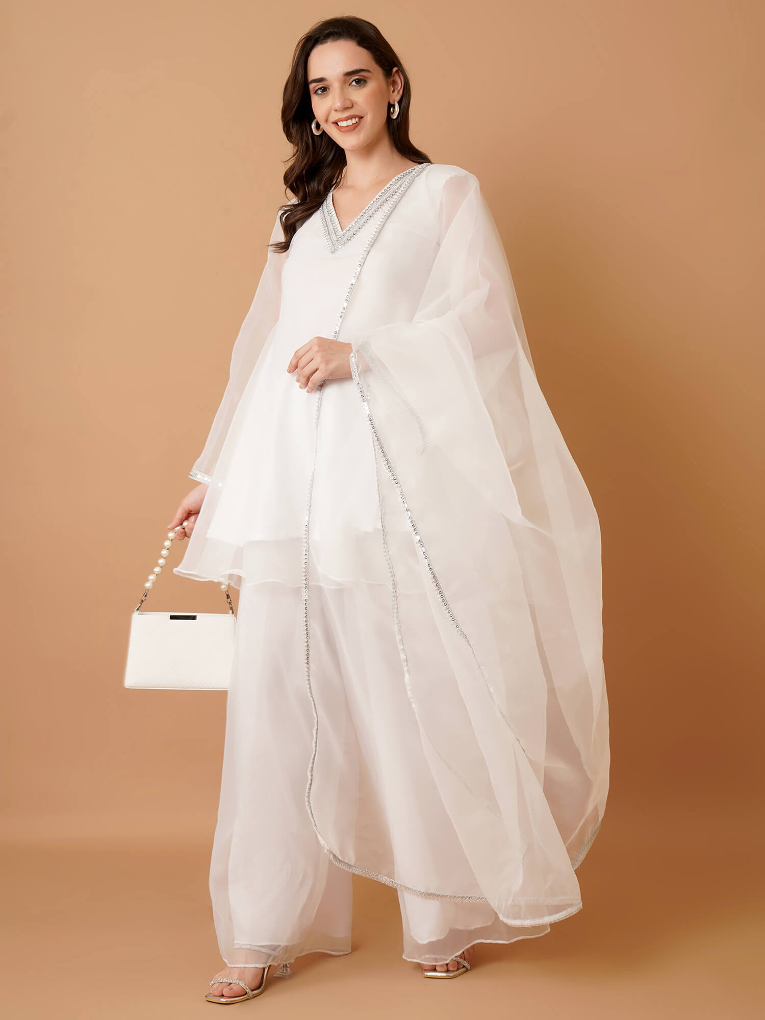Elegant and timeless, this black organza kurti set comes with matching palazzo pants and a sheer dupatta, making it a perfect blend of grace and sophistication. The lightweight organza fabric adds a subtle sheen and flow, while the tailored palazzo ensures comfort and ease of movement. Paired with a dupatta, it creates a complete festive and occasion-ready look.